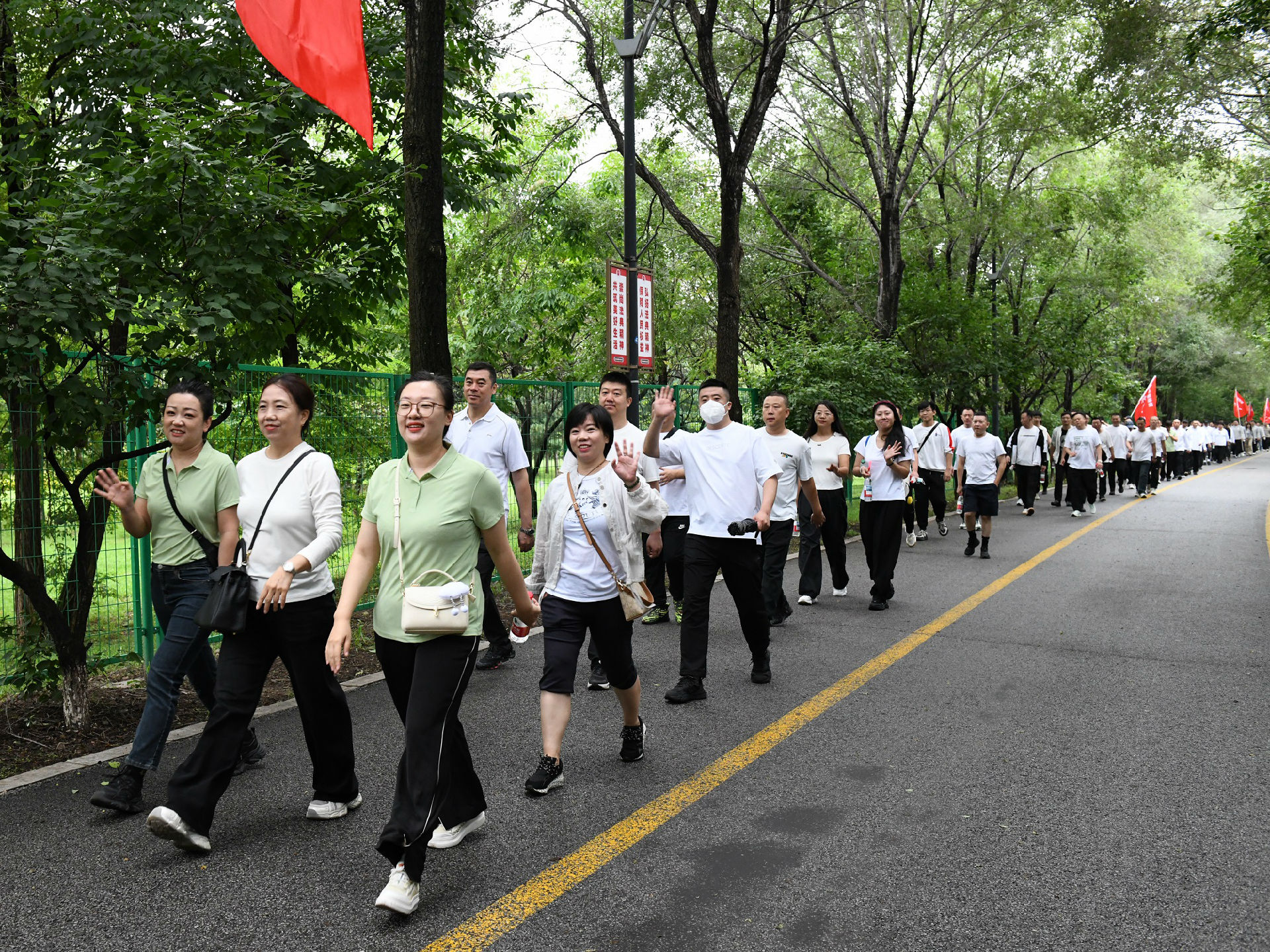 撫順特鋼第一副總經(jīng)理穆立峰為員工徒步健康行活動發(fā)令。伴隨著發(fā)令聲,公司領(lǐng)導(dǎo)與400余名員工圍繞月牙島開始5公里徒步健康行。一路上,大家揮舞隊(duì)旗、彩旗踏歌而行,每個人的臉上都洋溢著幸福的笑容。經(jīng)過一個多小時的努力,所有人都勝利到達(dá)終點(diǎn)。