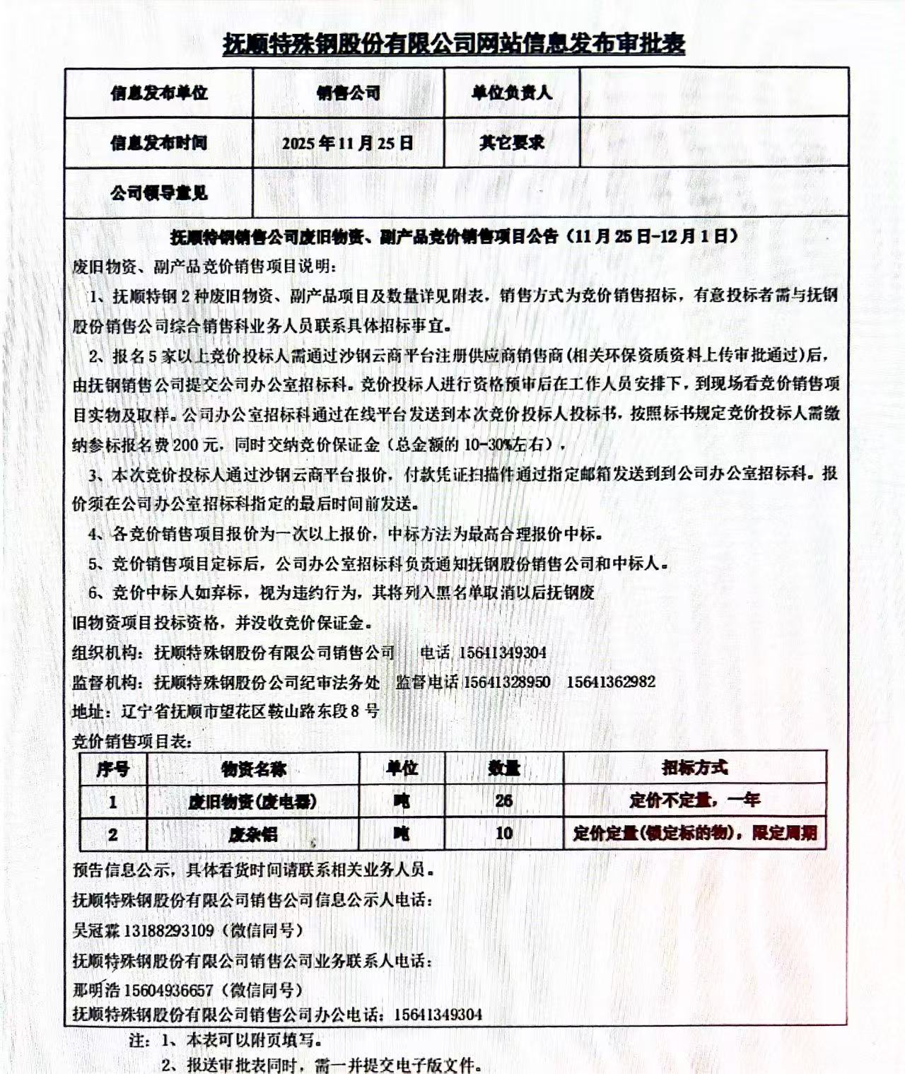 撫順特鋼銷售公司廢舊物資、副產(chǎn)品競價(jià)銷售項(xiàng)目公告(11月25日-12月1日)