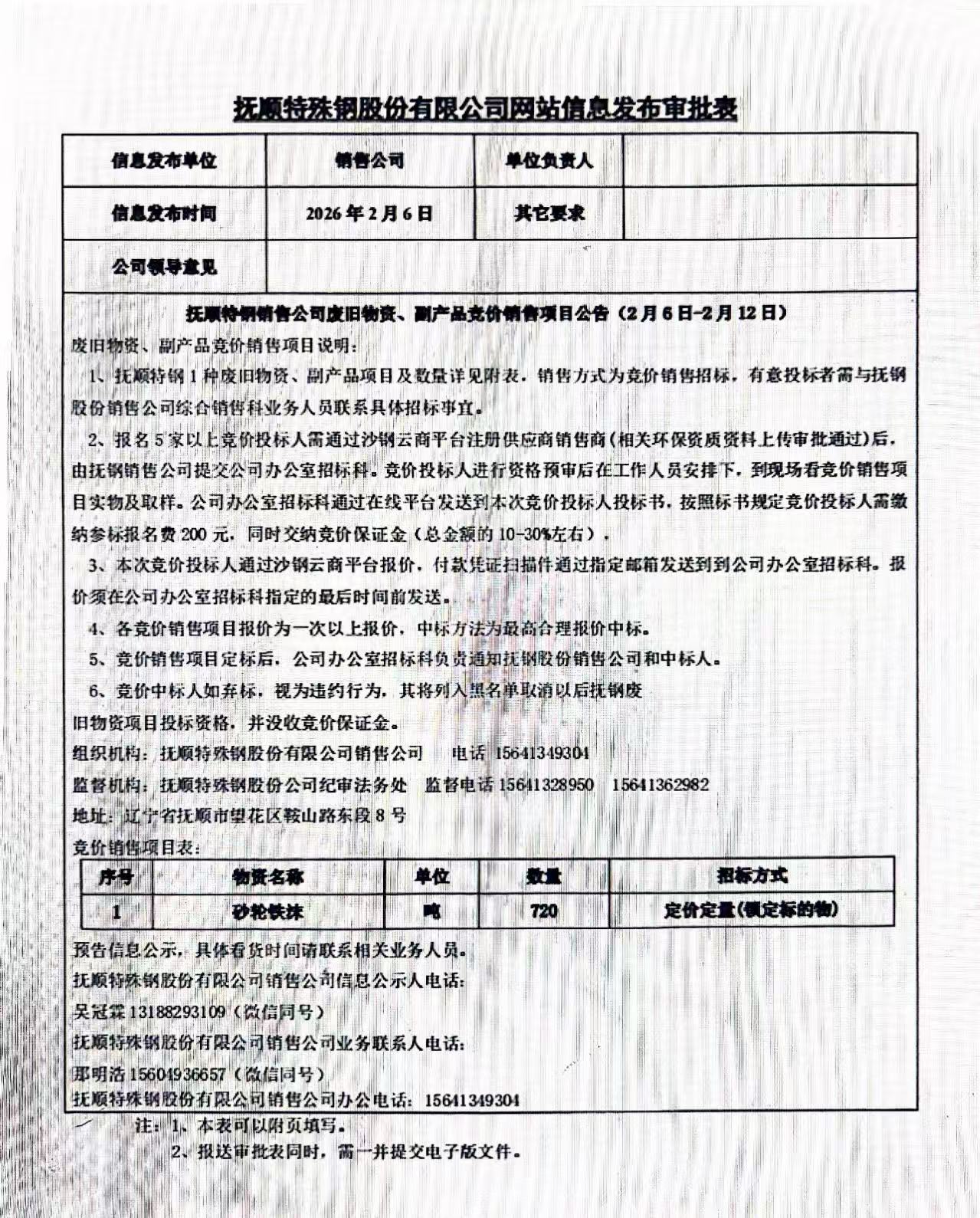 撫順特鋼銷售公司廢舊物資、副產品競價銷售項目公告(2月6日-2月12日)